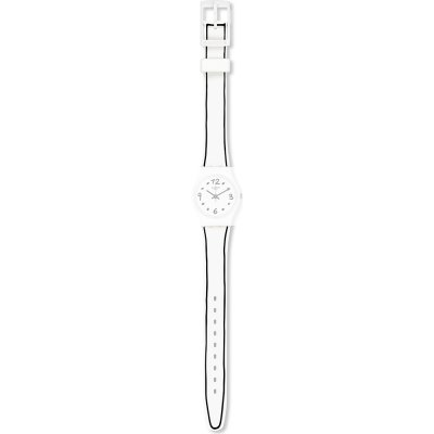 This Swatch watch strap is made of silicone and is attached to the watch by means of steel pins. The band has a width of 12 mm and is closed by means of a buckle. The strap has no straight mount which means that this strap is only suitable for the watches listed below.
