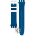 This Swatch watch strap is made of silicone and is attached to the watch by means of steel pins. The band has a width of 19.7 mm and is closed by means of a buckle. The strap has no straight mount which means that this strap is only suitable for the watches listed below.
