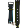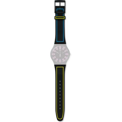 This Swatch watch strap is made of silicone and is attached to the watch by means of steel pins. The band has a width of 19.7 mm and is closed by means of a buckle. The strap has no straight mount which means that this strap is only suitable for the watches listed below.