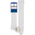 This Swatch watch strap is made of silicone and is attached to the watch by means of steel pins. The band has a width of 19.7 mm and is closed by means of a buckle. The strap has no straight mount which means that this strap is only suitable for the watches listed below.