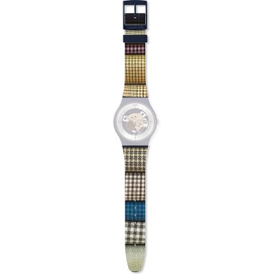 This Swatch watch strap is made of silicone and is attached to the watch by means of steel pins. The band has a width of 19.7 mm and is closed by means of a buckle. The strap has no straight mount which means that this strap is only suitable for the watches listed below.