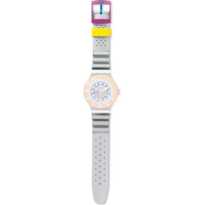 This Swatch watch strap is made of silicone and is attached to the watch by means of steel pins. The band has a width of 21.3 mm and is closed by means of a buckle. The strap has no straight mount which means that this strap is only suitable for the watches listed below.