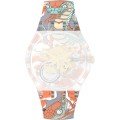 This Swatch watch strap is made of plastic/Resin and is attached to the watch by means of steel pins. The band has a width of 19.7 mm and is closed by means of a buckle. The strap has no straight mount which means that this strap is only suitable for the watches listed below.