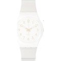 This Swatch watch strap is made of silicone and is attached to the watch by means of steel pins. The band has a width of 17 mm and is closed by means of a buckle. The strap has no straight mount which means that this strap is only suitable for the watches listed below.