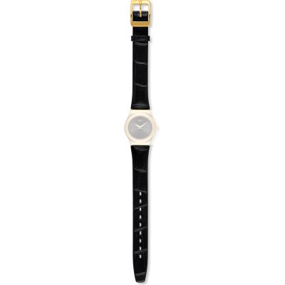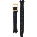 This Swatch watch strap is made of leather and is attached to the watch by means of steel pins. The band has a width of 12 mm and is closed by means of a buckle. The strap has no straight mount which means that this strap is only suitable for the watches listed below.