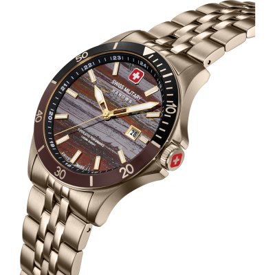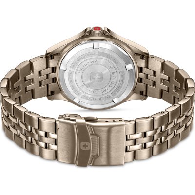 The watch is 10 ATM. This means the watch is suitable for swimming. The watch comes with Swiss Military 3+2.