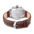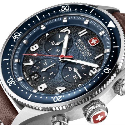 This Swiss Military Hanowa watch has a case made of stainless steel with a diameter of 43 mm and is fitted with a leather band. Inside the case lies a Ronda movement and the watch features a Sapphire crystal.