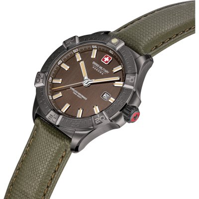 This Swiss Military Hanowa watch has a case made of stainless steel with a diameter of 42 mm and is fitted with a leather band. Inside the case lies a Ronda movement and the watch features a Sapphire crystal.