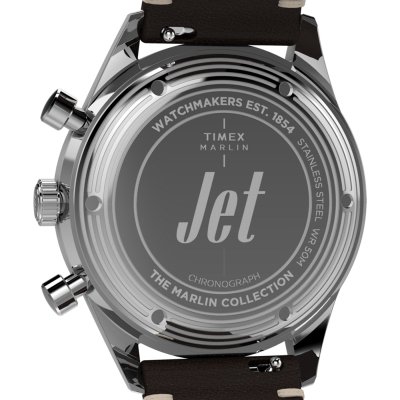 This Timex watch has a case made of stainless steel with a diameter of 40 mm and is fitted with a leather band. Inside the case lies a Timex movement and the watch features a Hesalite crystal.