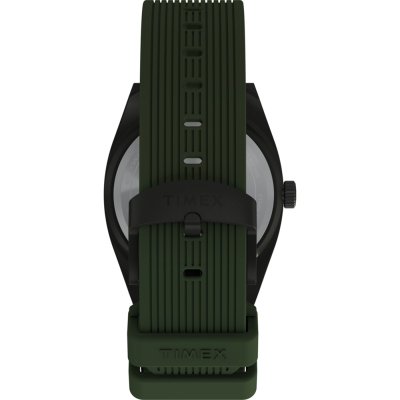 This Timex watch has a case made of metal alloy with a diameter of 39 mm and is fitted with a rubber band. Inside the case lies a Timex movement and the watch features a Mineral crystal.
