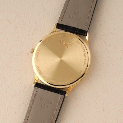 This Tissot watch has a case made of Gold 18K with a diameter of 33.5 mm and is fitted with a leather band. Inside the case lies a ETA movement and the watch features a Sapphire crystal.
