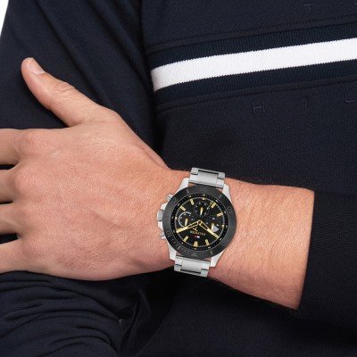 This Tommy Hilfiger watch has a case made of stainless steel with a diameter of 46 mm and is fitted with a stainless steel band. Inside the case lies a Seiko Instruments Inc. movement and the watch features a Mineral crystal.
