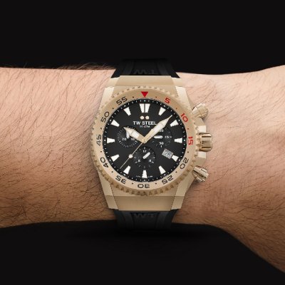 This TW Steel watch has a case made of stainless steel with a diameter of 44 mm and is fitted with a rubber band. Inside the case lies a Ronda movement and the watch features a Single anti-reflective sapphire crystal.