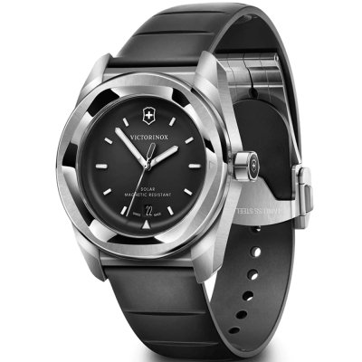 This Victorinox watch has a case made of stainless steel with a diameter of 39 mm and is fitted with a rubber band. Inside the case lies a Ronda movement and the watch features a Single anti-reflective sapphire crystal.