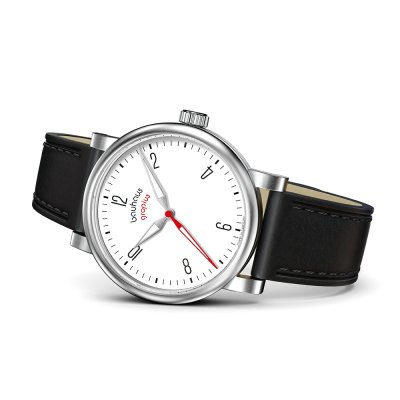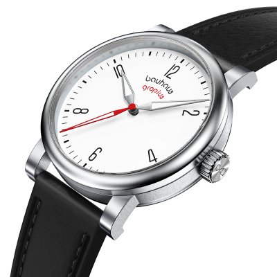 This Walter Gropius watch has a case made of stainless steel with a diameter of 40 mm and is fitted with a leather band. Inside the case lies a Seiko Instruments Inc. movement and the watch features a Double anti-reflective sapphire crystal.