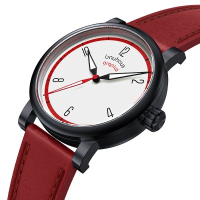 This Walter Gropius watch has a case made of stainless steel with a diameter of 40 mm and is fitted with a leather band. Inside the case lies a Seiko Instruments Inc. movement and the watch features a Double anti-reflective sapphire crystal.