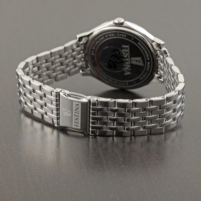 Diese Festina Uhr hat ein Edelstahl Gehäuse mit einem Durchmesser von 39 mm und ist mit einem Armband aus Edelstahl versehen. In der Uhr arbeitet ein Miyota Uhrwerk. Das Glas der Uhr besteht aus Mineral - Glas.
