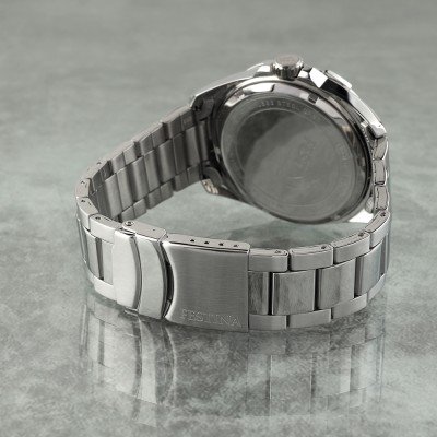 Diese Festina Uhr hat ein Edelstahl Gehäuse mit einem Durchmesser von 44 mm und ist mit einem Armband aus Edelstahl versehen. In der Uhr arbeitet ein Miyota Uhrwerk. Das Glas der Uhr besteht aus Mineral - Glas.