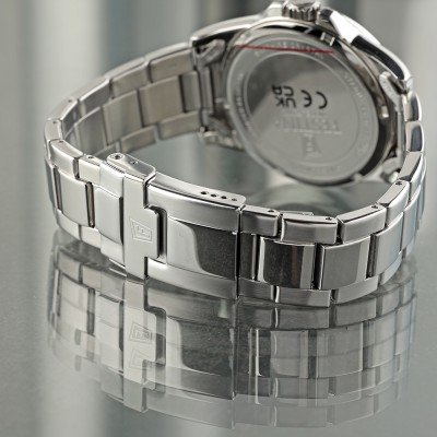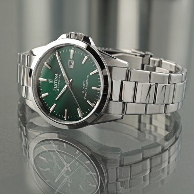 Diese Festina Uhr hat ein Edelstahl Gehäuse mit einem Durchmesser von 41 mm und ist mit einem Armband aus Edelstahl versehen. In der Uhr arbeitet ein Ronda Uhrwerk. Das Glas der Uhr besteht aus Mineral - Glas.