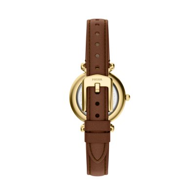 Diese Fossil Uhr hat ein Edelstahl Gehäuse mit einem Durchmesser von 28 mm und ist mit einem Armband aus Leder versehen. In der Uhr arbeitet ein Seiko Instruments Inc. Uhrwerk. Das Glas der Uhr besteht aus Mineral - Glas.