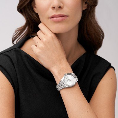 Diese Fossil Uhr hat ein Edelstahl Gehäuse mit einem Durchmesser von 38 mm und ist mit einem Armband aus Edelstahl versehen. In der Uhr arbeitet ein Miyota Uhrwerk. Das Glas der Uhr besteht aus Mineral - Glas.