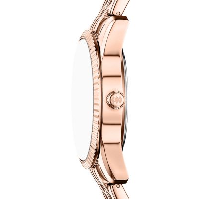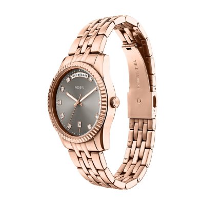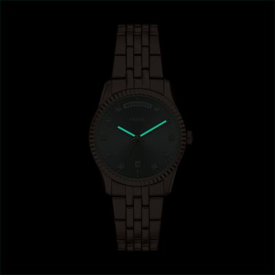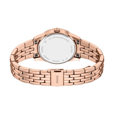 Diese Fossil Uhr hat ein Edelstahl Gehäuse mit einem Durchmesser von 34 mm und ist mit einem Armband aus Edelstahl versehen. In der Uhr arbeitet ein Seiko Instruments Inc. Uhrwerk. Das Glas der Uhr besteht aus Mineral - Glas.