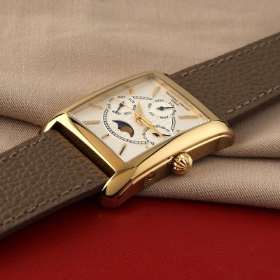 Die Frederique Constant Classics Carrée Moonphase Uhr ist ein raffinierter und außergewöhnlicher Zeitmesser mit zahlreichen Funktionen. Das Quarzwerk FC-265 zeigt Stunden, Minuten, Sekunden sowie das Datum, den Tag, den Monat und die Mondphase an und verfügt über eine beeindruckende Batterielebensdauer von 60 Monaten. All dies ist in einem rechteckigen, 42,30 x 30 mm großen Gehäuse aus poliertem, gelbvergoldetem Edelstahl untergebracht. Das silberne Zifferblatt mit Sonnenschliff und geprägtem Muster in der Mitte wird durch vergoldete Indexe und Zeiger ergänzt und bietet eine perfekte Ablesbarkeit.