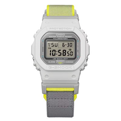 Diese G-Shock Uhr hat ein Bio-Kunststoff Gehäuse mit einem Durchmesser von 42.8 mm und ist mit einem Armband aus Textil versehen. In der Uhr arbeitet ein Casio Uhrwerk. Das Glas der Uhr besteht aus Mineral - Glas.