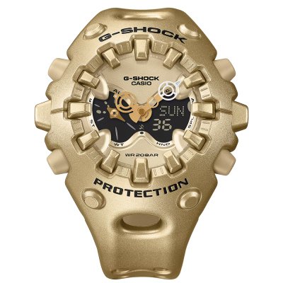Manchmal denkt man, dass es im 21. Jahrhundert nichts mehr an Uhren zu verbessern gibt, aber dann hat man nicht auf G-Shock geachtet. Nach vierzig Jahren ständiger Innovation ist es der Marke wieder einmal gelungen, die Uhrenwelt mit einem völlig einzigartigen und originellen Design zu revolutionieren. Mit einem völlig neuen Ansatz bei Konstruktion und Design hat die GA-V01 nicht nur ein spektakuläres Aussehen, sondern ist auch äußerst stoßfest und birgt bemerkenswerte technische Innovationen: Die Gehäusekonstruktion, die das Uhrwerk schützt, nutzt eine integrierte Lünetten- und Armbandkonstruktion, die das Glas teilweise überlappt und somit auch als Stoßdämpfer fungiert, um Stöße zu absorbieren. Casio hat auch eine neue magnetische Zeigerkonstruktion entwickelt, bei der die Zeiger, die normalerweise anfällig für Stöße sind, nicht an der Achse befestigt sind, sondern durch Magnetkraft gehalten werden. Dadurch können sie Stöße effektiv absorbieren und ableiten. Diese neue Technologie ermöglicht auch die Herstellung größerer, einzigartig geformter Zeiger, da die Achse ihr Gewicht nicht tragen muss. Nach einem Stoß oder einer Erschütterung können die Zeiger vorübergehend aus ihrer Position geraten, aber innerhalb weniger Minuten kehren sie auf fast magische Weise in ihre ursprüngliche Position zurück. Das analog-digitale Zifferblatt ist mehrschichtig aufgebaut und besteht aus einem Metallzifferblatt mit Gitterelementen, die dekorative Einblicke ins Innere gewähren, und einem LCD-Display. Diese Uhr ist nichts für Risikoscheue. Sie ist auffällig, groß und sorgt garantiert für Gesprächsstoff! Und Sie können sich darauf verlassen, dass das robuste und leistungsstarke Uhrwerk trotz aller Stöße und Erschütterungen immer funktioniert!