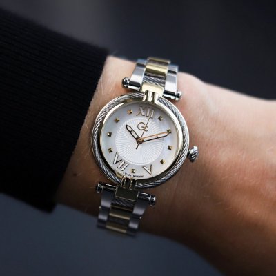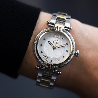Diese GC Uhr hat ein Edelstahl Gehäuse mit einem Durchmesser von 32 mm und ist mit einem Armband aus Edelstahl versehen. In der Uhr arbeitet ein Ronda Uhrwerk. Das Glas der Uhr besteht aus Saphirbeschichtetes Mineralglas - Glas.