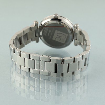 Diese GC Uhr hat ein Edelstahl Gehäuse mit einem Durchmesser von 34 mm und ist mit einem Armband aus Metall versehen. In der Uhr arbeitet ein Ronda Uhrwerk. Das Glas der Uhr besteht aus Sapphir - Glas.