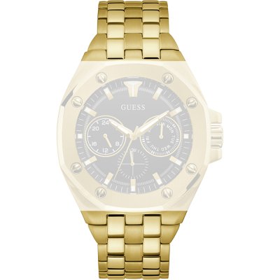 Dieses Guess Uhrarmband ist aus edelstahl gefertigt und wird mit druckstifte an der Uhr befestigt. Das Band hat eine Breite von 28 mm und wird mit einer faltschließe mit Druckknöpfen geschlossen. Das Uhrenarmband hat keine gerade Halterung, was bedeutet, dass dieses Band nur für die unten aufgeführten Uhren geeignet ist.