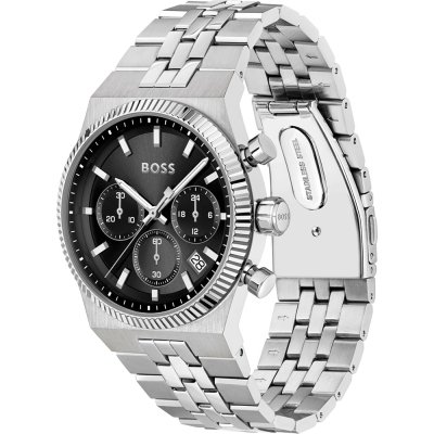 Diese Hugo Boss Uhr hat ein Edelstahl Gehäuse mit einem Durchmesser von 41 mm und ist mit einem Armband aus Edelstahl versehen. In der Uhr arbeitet ein Seiko Instruments Inc. Uhrwerk. Das Glas der Uhr besteht aus Mineral - Glas.