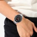 Diese Hugo Boss Uhr hat ein Edelstahl Gehäuse mit einem Durchmesser von 42 mm und ist mit einem Armband aus Edelstahl versehen. In der Uhr arbeitet ein Miyota Uhrwerk. Das Glas der Uhr besteht aus Mineral - Glas.