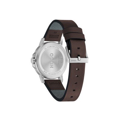 Diese Hugo Boss Uhr hat ein Edelstahl Gehäuse mit einem Durchmesser von 41 mm und ist mit einem Armband aus Leder versehen. In der Uhr arbeitet ein Seiko Uhrwerk. Das Glas der Uhr besteht aus Mineral - Glas.