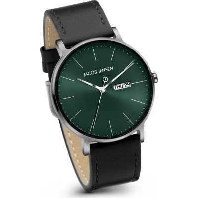 Diese Jacob Jensen Uhr hat ein Titan Gehäuse mit einem Durchmesser von 40 mm und ist mit einem Armband aus Leder versehen. In der Uhr arbeitet ein Miyota Uhrwerk. Das Glas der Uhr besteht aus Sapphir - Glas.