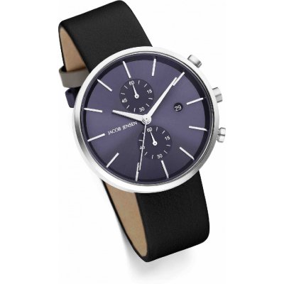 Diese Jacob Jensen Uhr hat ein Edelstahl Gehäuse mit einem Durchmesser von 42 mm und ist mit einem Armband aus Leder versehen. In der Uhr arbeitet ein Seiko Instruments Inc. Uhrwerk. Das Glas der Uhr besteht aus Sapphir - Glas.