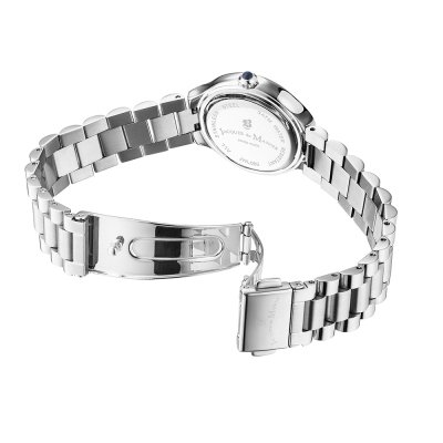 Diese Jacques du Manoir Uhr hat ein Edelstahl Gehäuse mit einem Durchmesser von 29 mm und ist mit einem Armband aus Edelstahl versehen. In der Uhr arbeitet ein Ronda Uhrwerk. Das Glas der Uhr besteht aus Mineral - Glas.