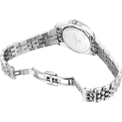 Diese Jacques du Manoir Uhr hat ein Edelstahl Gehäuse mit einem Durchmesser von 33 mm und ist mit einem Armband aus Edelstahl versehen. In der Uhr arbeitet ein Ronda Uhrwerk. Das Glas der Uhr besteht aus Mineral - Glas.