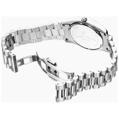 Diese Jacques du Manoir Uhr hat ein Edelstahl Gehäuse mit einem Durchmesser von 40 mm und ist mit einem Armband aus Edelstahl versehen. In der Uhr arbeitet ein Ronda Uhrwerk. Das Glas der Uhr besteht aus Mineral - Glas.