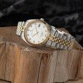 Diese Jacques du Manoir Uhr hat ein Edelstahl Gehäuse mit einem Durchmesser von 36 mm und ist mit einem Armband aus Edelstahl versehen. In der Uhr arbeitet ein Ronda Uhrwerk. Das Glas der Uhr besteht aus Mineral - Glas.
