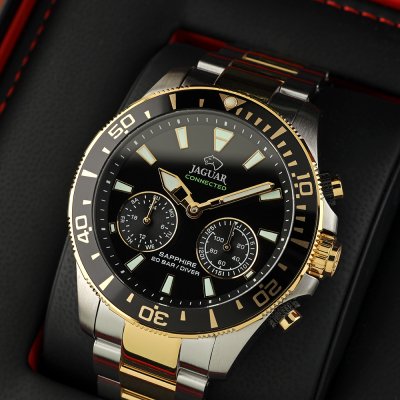 Diese Jaguar Uhr hat ein Edelstahl Gehäuse mit einem Durchmesser von 45 mm und ist mit einem Armband aus Edelstahl versehen. In der Uhr arbeitet ein Kronaby Uhrwerk. Das Glas der Uhr besteht aus Sapphir - Glas.