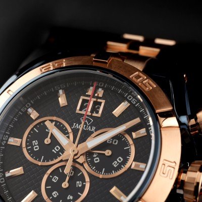 Diese Jaguar Uhr hat ein Edelstahl Gehäuse mit einem Durchmesser von 45 mm und ist mit einem Armband aus Edelstahl versehen. In der Uhr arbeitet ein Ronda Uhrwerk. Das Glas der Uhr besteht aus Sapphir - Glas.