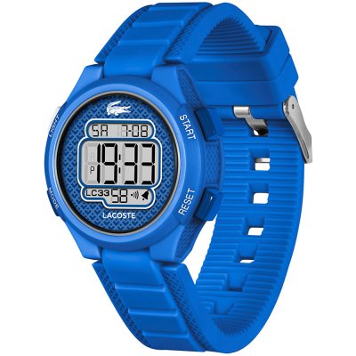 Diese Lacoste Uhr hat ein Kunstharz Gehäuse mit einem Durchmesser von 34 mm und ist mit einem Armband aus Kautschuk versehen.