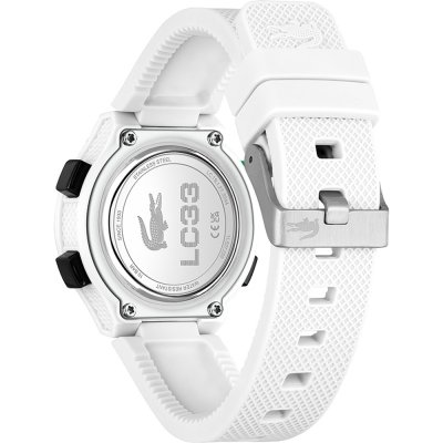 Diese Lacoste Uhr hat ein Kunstharz Gehäuse mit einem Durchmesser von 34 mm und ist mit einem Armband aus Kautschuk versehen.