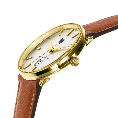 Diese LIP Uhr hat ein Edelstahl Gehäuse mit einem Durchmesser von 38 mm und ist mit einem Armband aus Leder versehen. In der Uhr arbeitet ein Ronda Uhrwerk. Das Glas der Uhr besteht aus Sapphir - Glas.