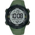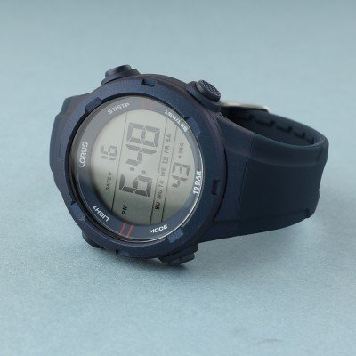Diese Lorus Uhr hat ein Kunstharz Gehäuse mit einem Durchmesser von 46 mm und ist mit einem Armband aus Kautschuk versehen. In der Uhr arbeitet ein Seiko Instruments Inc. Uhrwerk. Das Glas der Uhr besteht aus Acryl - Glas.