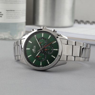 Diese Lotus Uhr hat ein Edelstahl Gehäuse mit einem Durchmesser von 42 mm und ist mit einem Armband aus Edelstahl versehen. In der Uhr arbeitet ein Miyota Uhrwerk. Das Glas der Uhr besteht aus Mineral - Glas.