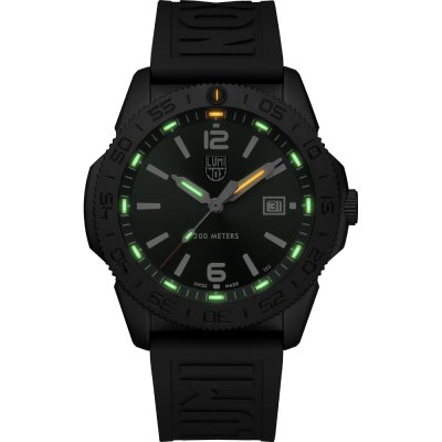 Diese Luminox Uhr hat ein Edelstahl Gehäuse mit einem Durchmesser von 44 mm und ist mit einem Armband aus Kautschuk versehen. In der Uhr arbeitet ein Ronda Uhrwerk. Das Glas der Uhr besteht aus Sapphir - Glas.