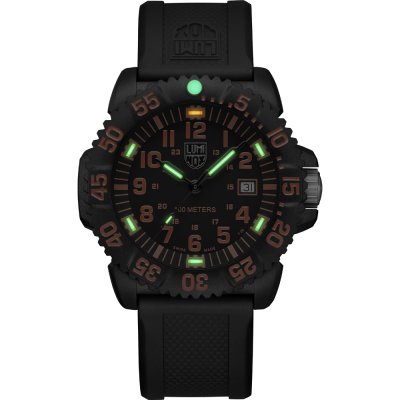 Diese Luminox Uhr hat ein Carbon Gehäuse mit einem Durchmesser von 44 mm und ist mit einem Armband aus Kautschuk versehen. In der Uhr arbeitet ein Ronda Uhrwerk. Das Glas der Uhr besteht aus Mineral - Glas.